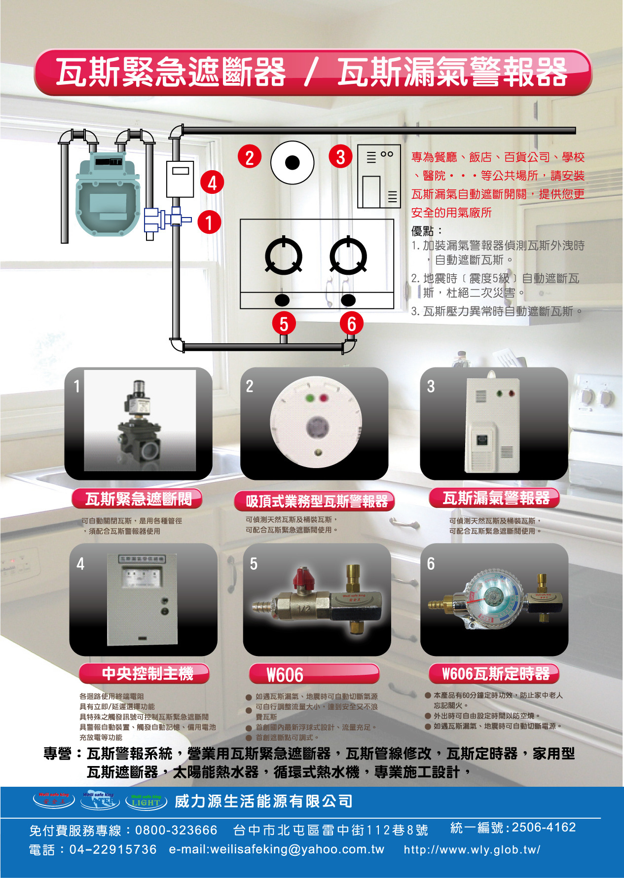 | 1. 加裝漏氣警報器偵測瓦斯外洩時,自動遮斷瓦斯。 |